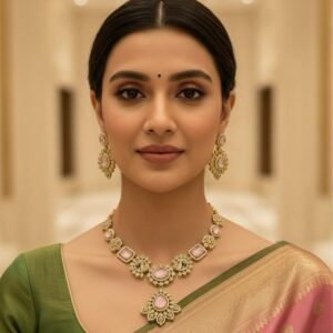 Heritage Gold Polish Necklace Set with Earrings – Pink & Green Stone Work