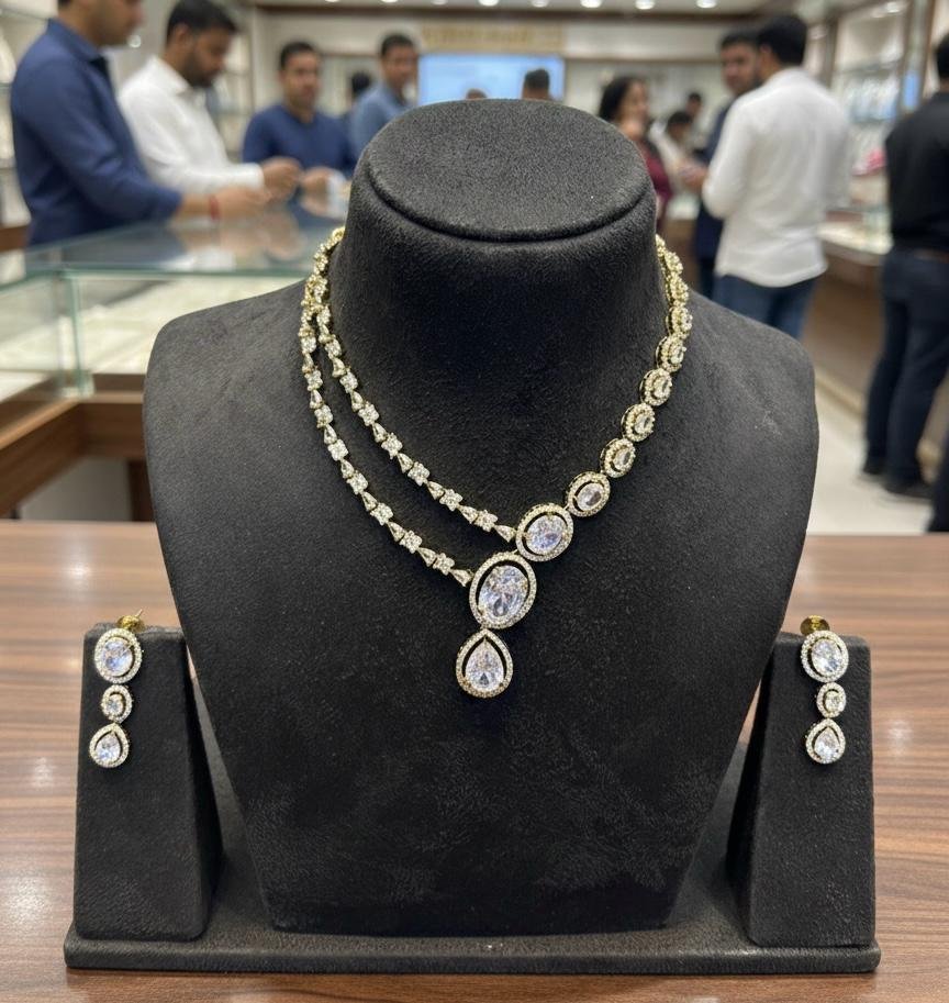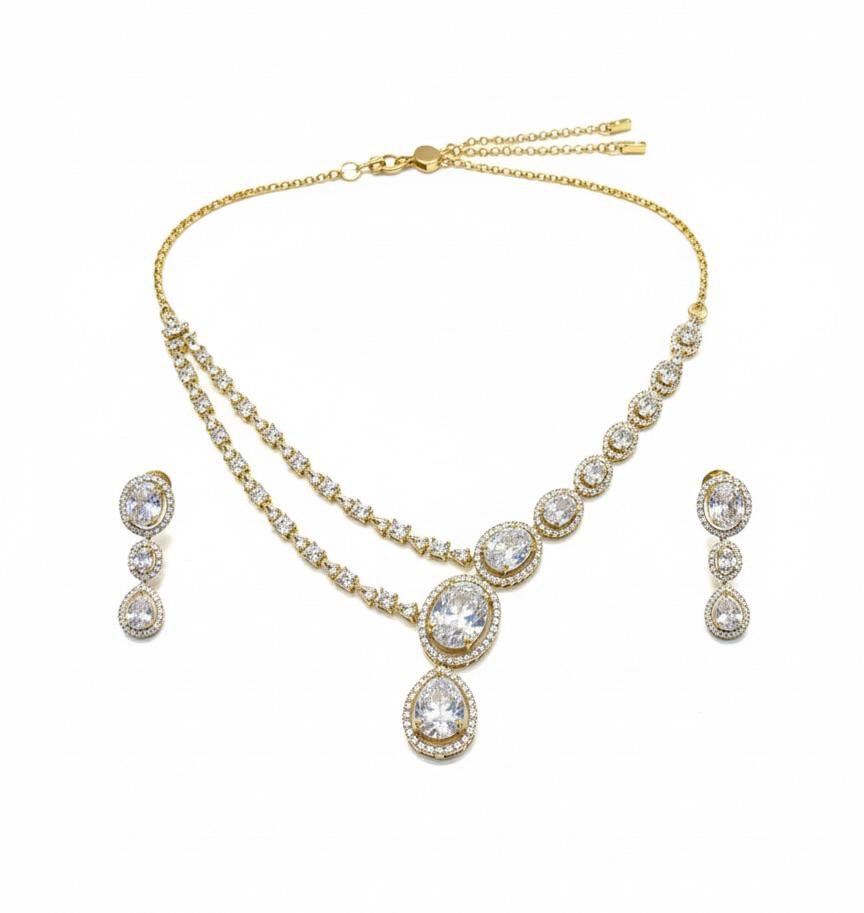 Premium American Diamond AD necklace jewellery set with elegant antique gold polish, perfect for weddings and festive occasions.