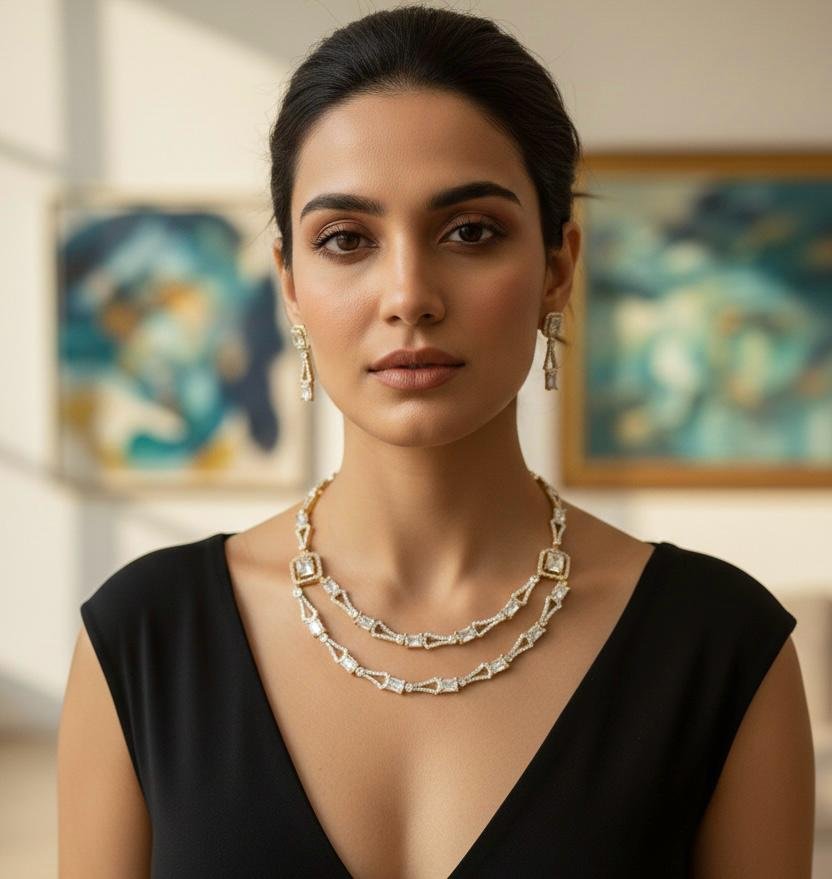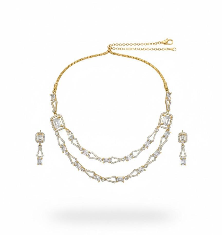 Elegant American Diamond AD necklace jewellery set with antique gold polish, ideal for weddings, festive, and party wear.