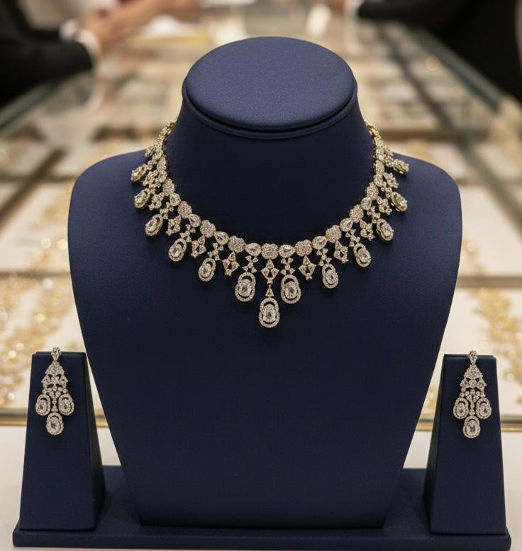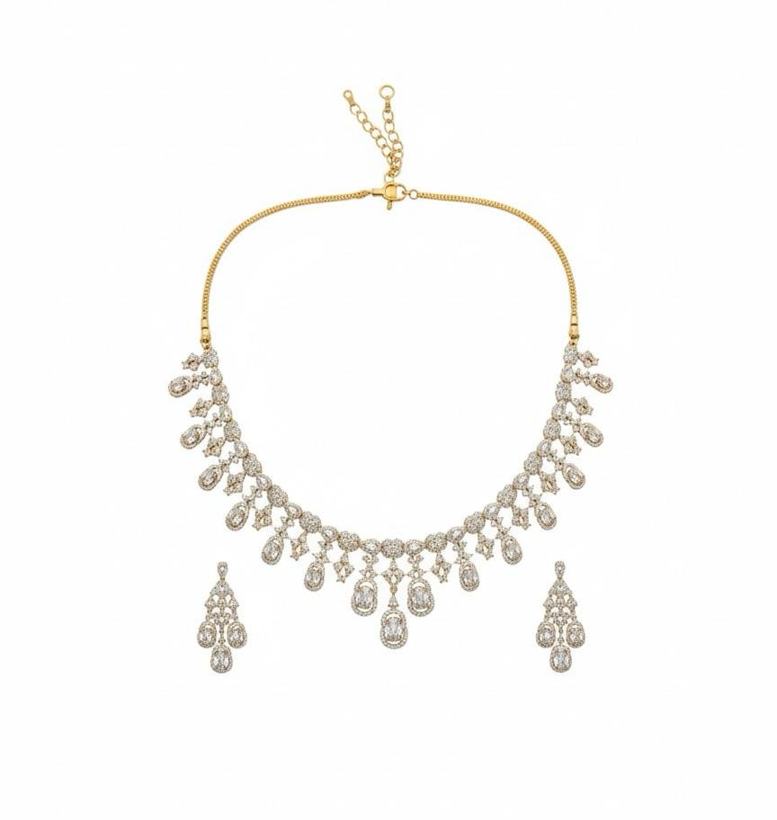 Premium American Diamond AD necklace jewellery set with elegant antique gold polish, perfect for weddings and festive occasions.