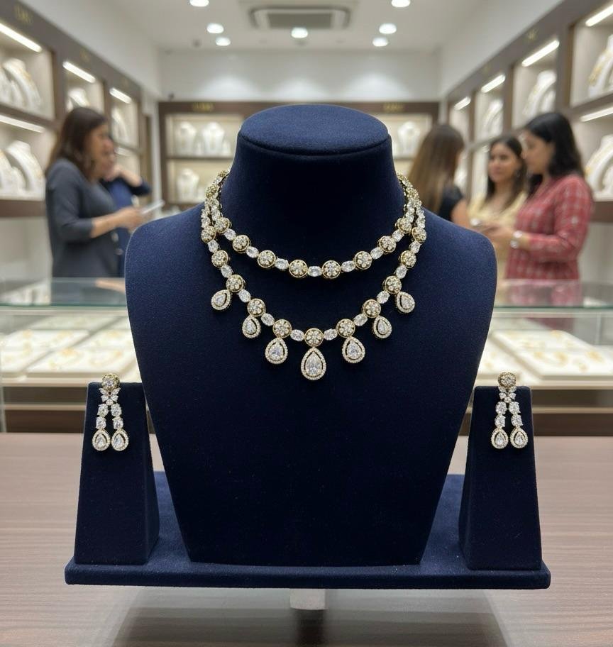 Add a touch of royal elegance to your jewellery collection with this exquisite American Diamond AD Necklace Jewellery Set, crafted with a luxurious antique gold polish that gives a timeless and traditional finish. Embellished with high-quality American diamond stones, this set offers brilliant sparkle and a premium look.