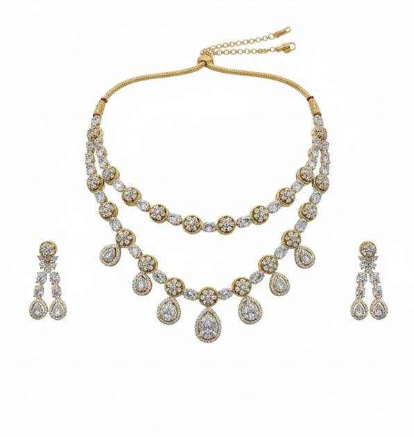 Premium American Diamond AD necklace jewellery set with rich antique gold polish, perfect for weddings and festive occasions.