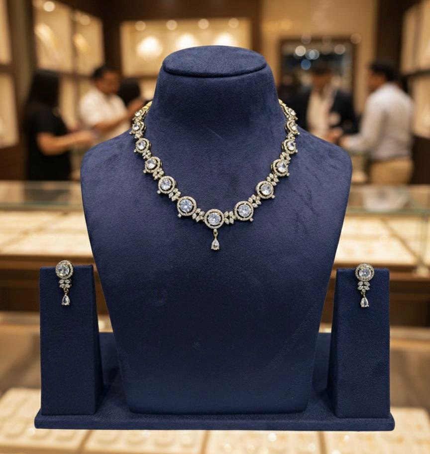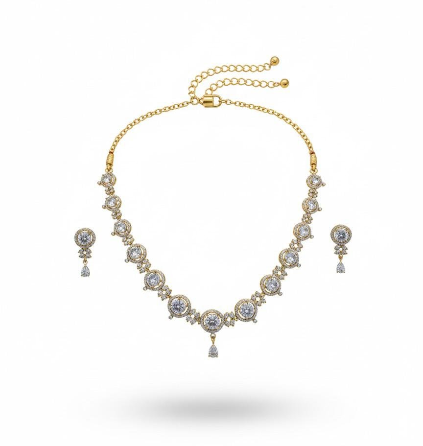 Elegant American Diamond AD necklace jewellery set with antique gold polish, ideal for festive and party wear.