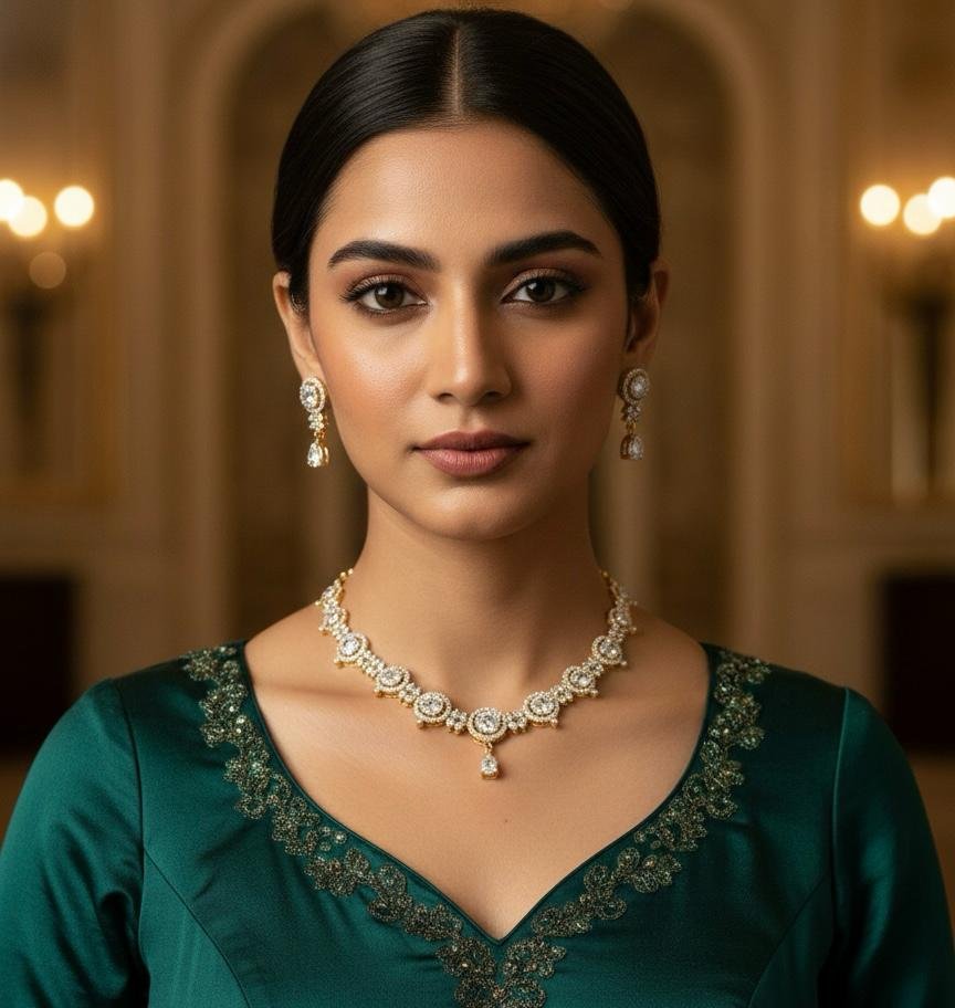 Be the first to review “American Diamond Antique Gold Polish AD Necklace Jewellery Set”
