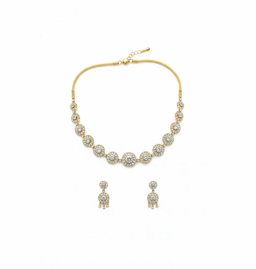 Premium American Diamond AD necklace jewellery set with elegant antique gold polish, perfect for weddings and festive wear.