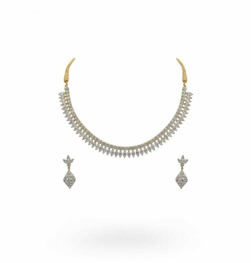 Enhance your ethnic look with this beautifully crafted American Diamond AD Necklace Jewellery Set, finished with a rich antique gold polish that gives a premium traditional appeal. Studded with sparkling American diamonds, this set reflects elegance and sophistication, making it an ideal choice for special occasions.