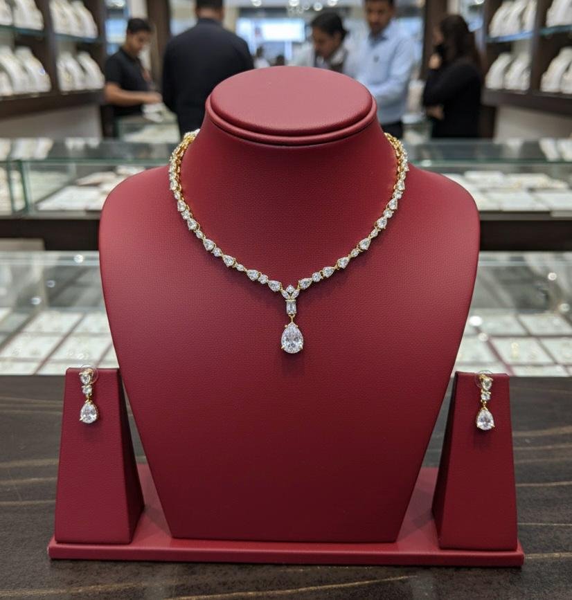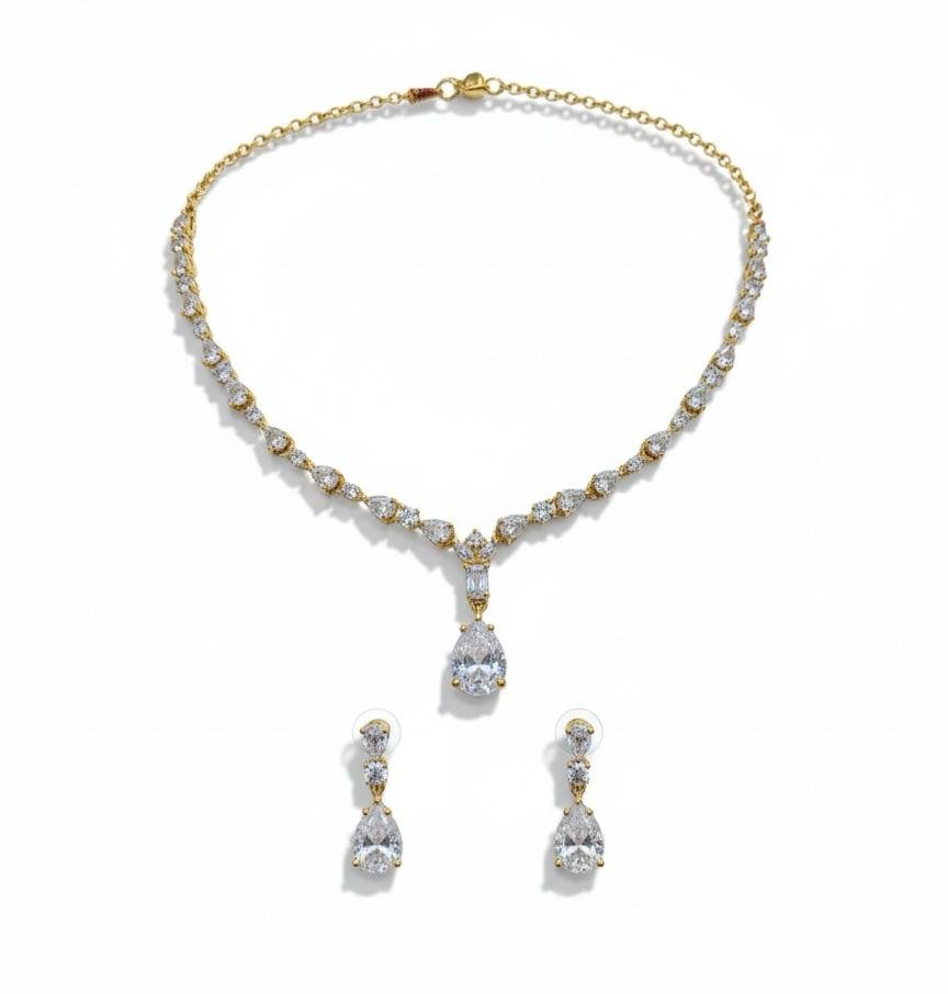 Elegant American Diamond AD necklace jewellery set with rich antique gold polish, perfect for weddings, parties, and festive wear.
