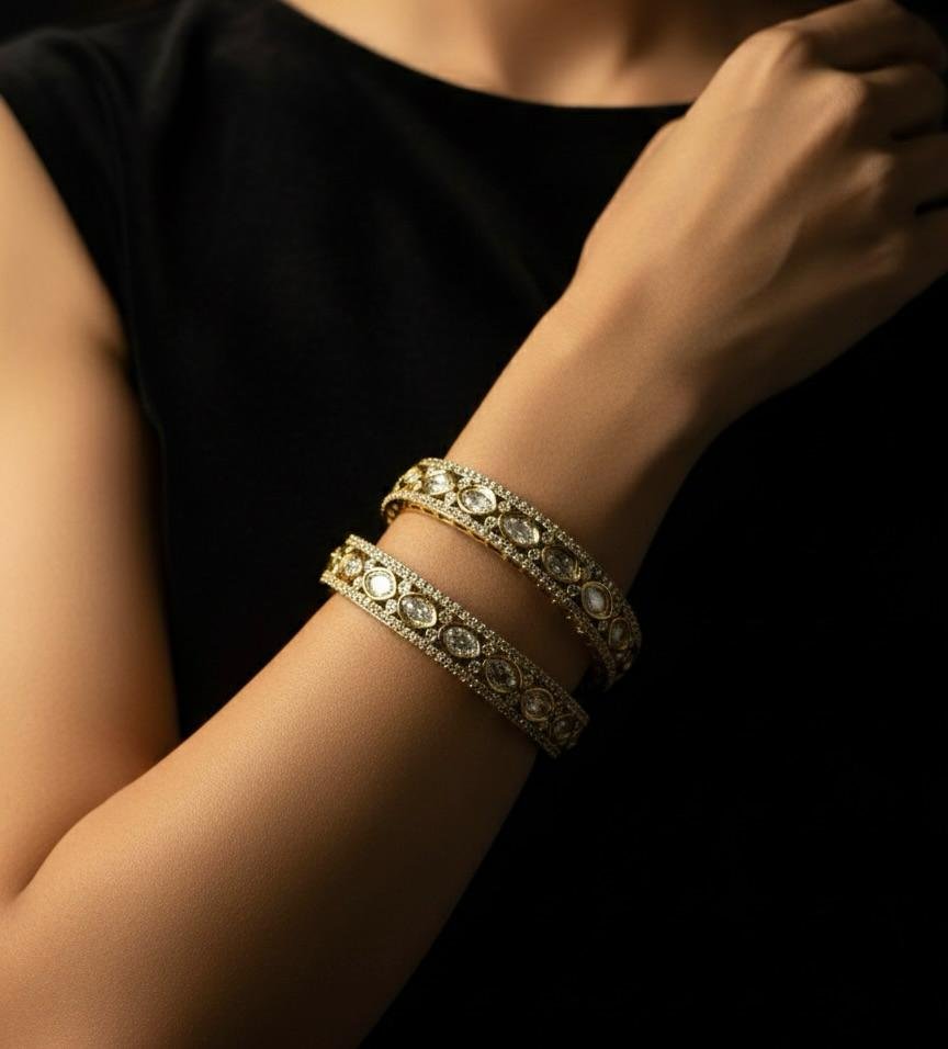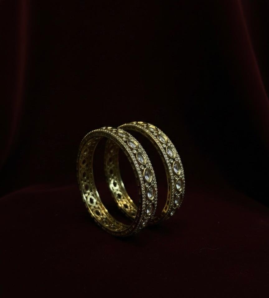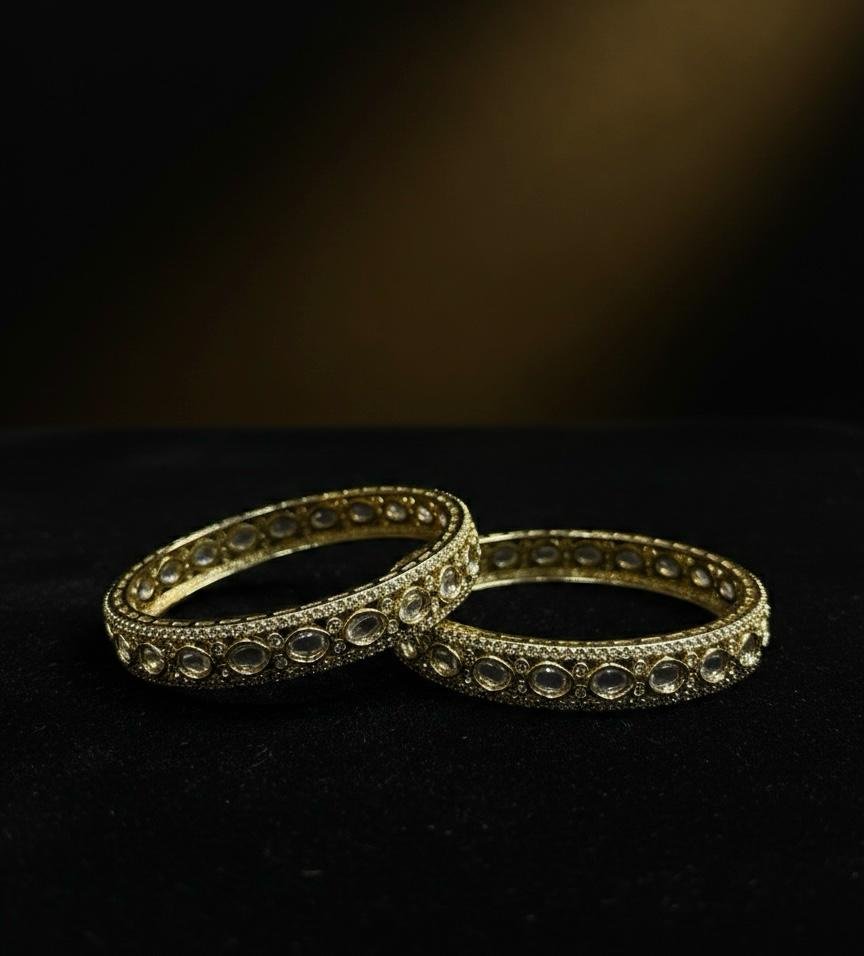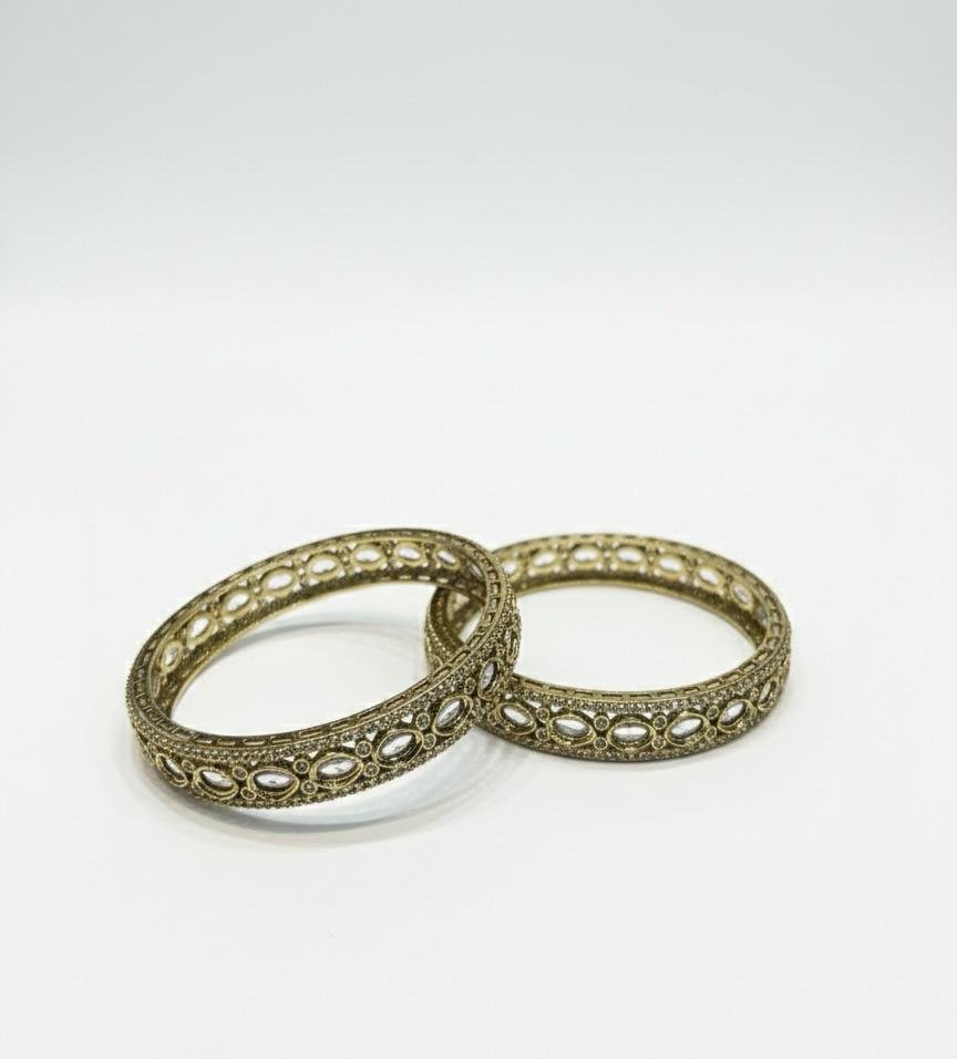 Enhance your traditional look with these beautifully crafted American Diamond Antique Gold Polish Bangles. Designed with sparkling American diamonds and finished in a rich antique gold polish, these bangles offer a luxurious and timeless appeal. Perfectly suited for weddings, festive occasions, and ethnic celebrations, they pair effortlessly with sarees, lehengas, and traditional outfits.