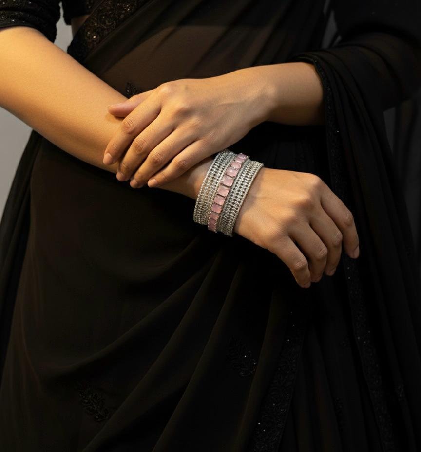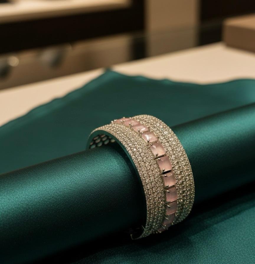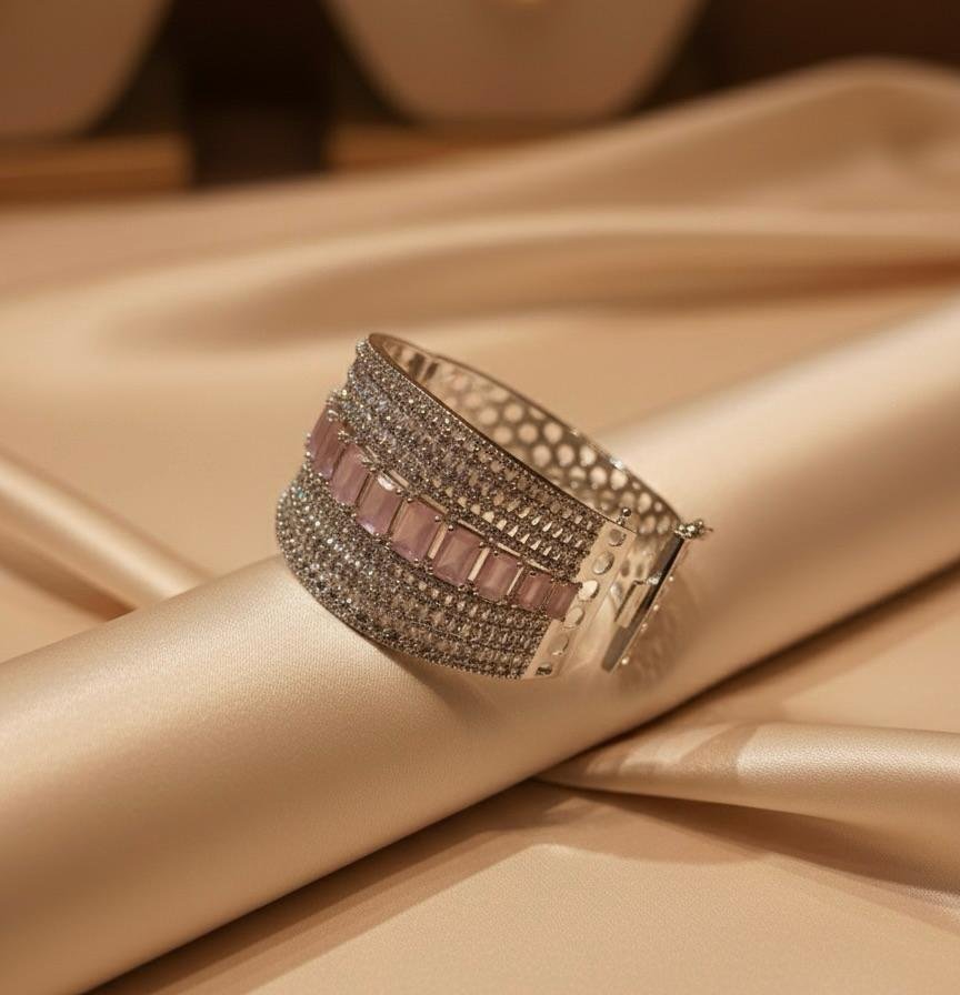 Stylish silver-plated adjustable bracelet featuring sparkling American diamond stones and an elegant pink color stone. Perfect for daily wear and special occasions.