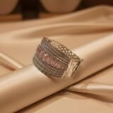 This American Diamond Pink Stone Bracelet is beautifully crafted with a high-quality silver plating polish that gives a long-lasting shine. Adorned with sparkling American diamond stones and a soft pink color stone, it adds a graceful and elegant touch to any outfit.