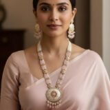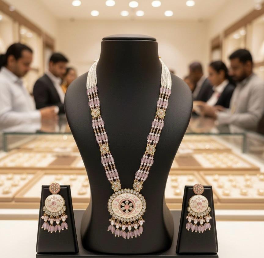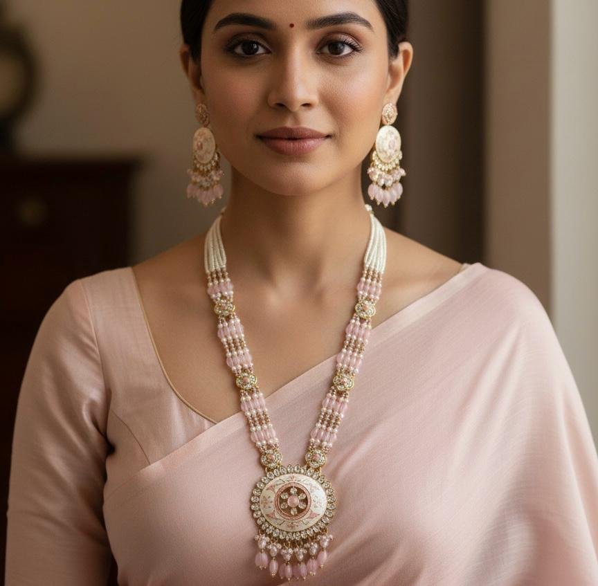 Make a graceful statement with this stunning Long Necklace Set featuring Pearl Work in Pink Colour Combination, finished with elegant antique gold polish. The beautiful blend of soft pink tones and delicate pearl detailing creates a rich and feminine look perfect for special occasions.