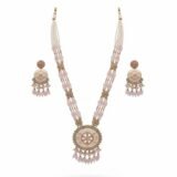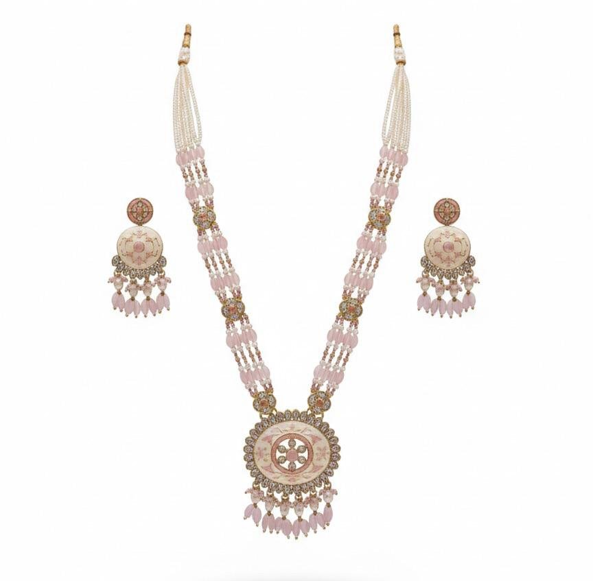 Antique gold long necklace set with pearl work and pink colour combination. Perfect for weddings and festive occasions.