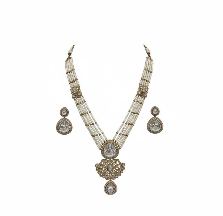 Antique polish long necklace set with elegant white pearl work. Perfect for weddings and festive occasions.