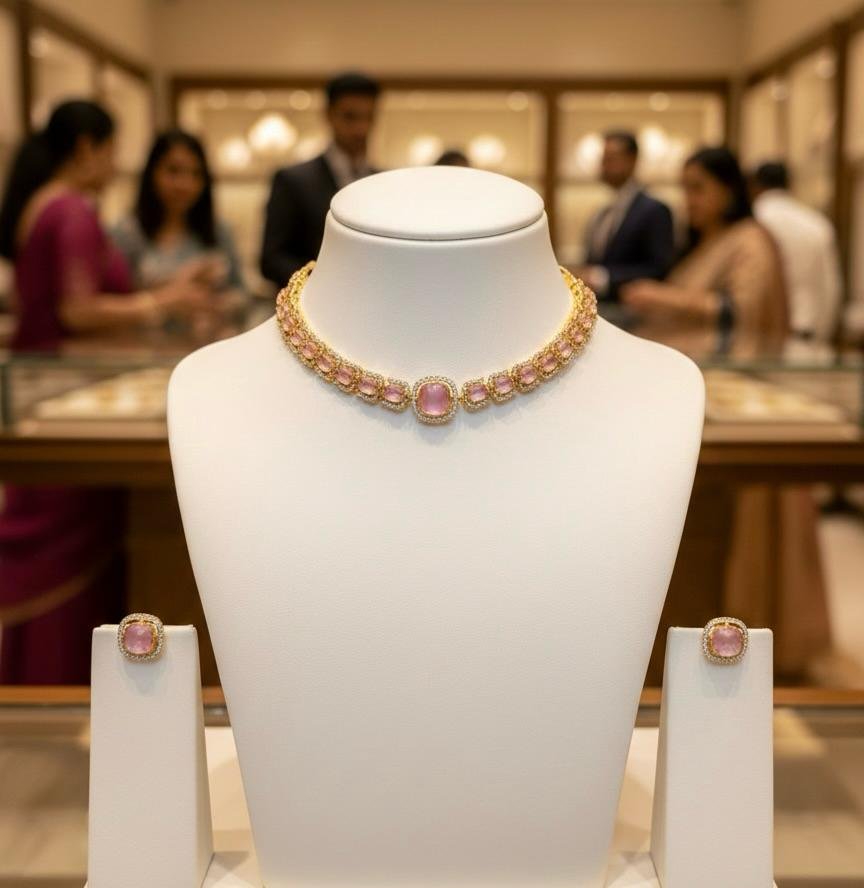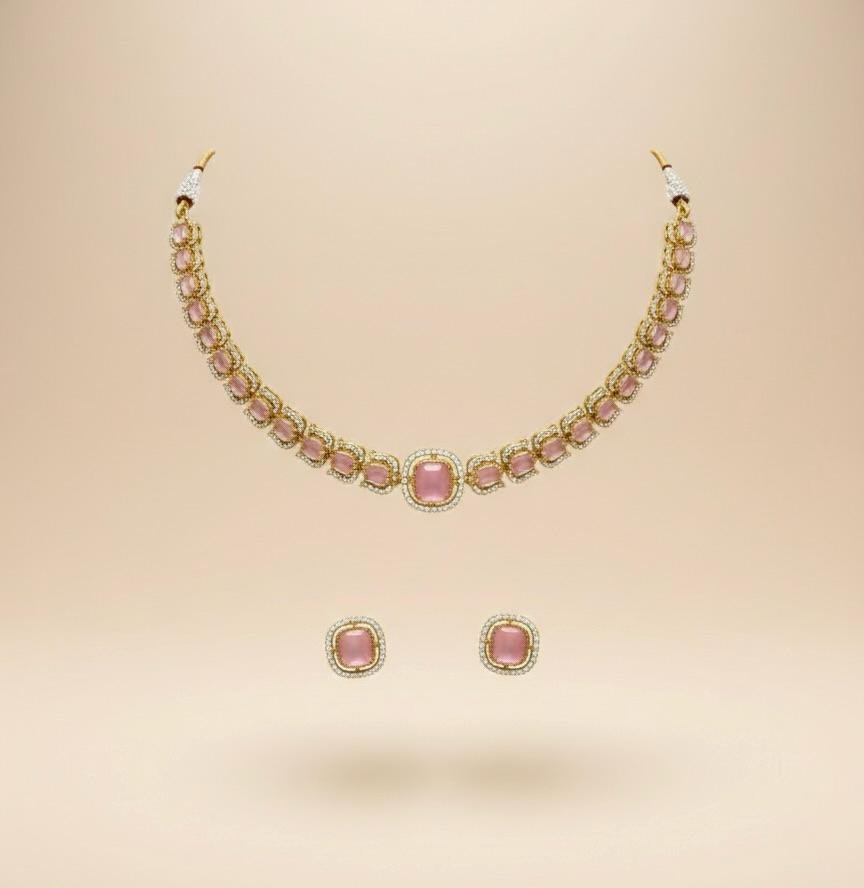 Beautiful American diamond necklace jewellery set in a soft baby pink colour combination with antique gold polish. Perfect for festive and party wear.