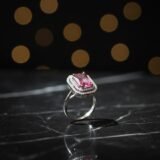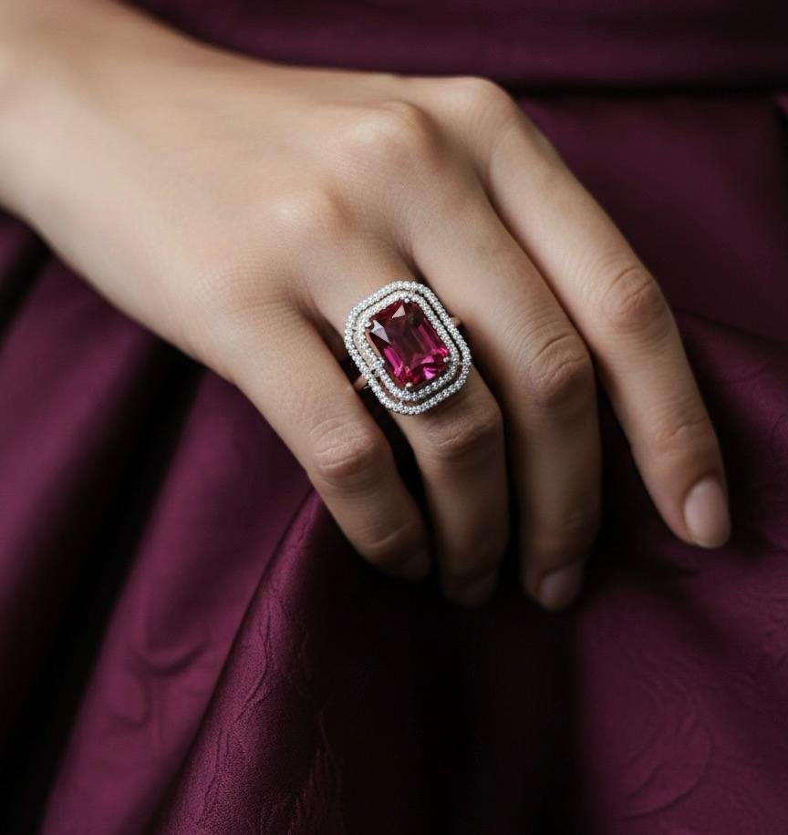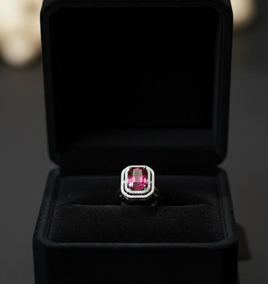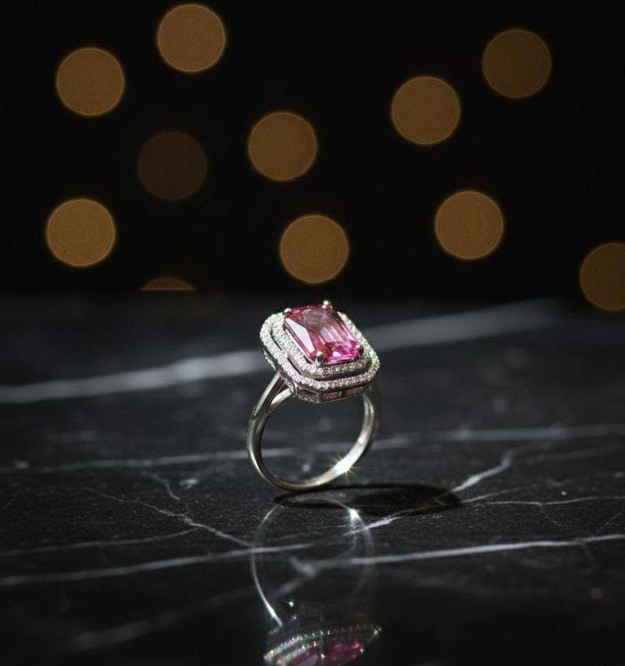 Charming American diamond finger ring with smooth silver plating polish, delicate silver and pink stone work, and adjustable size for a perfect fit.