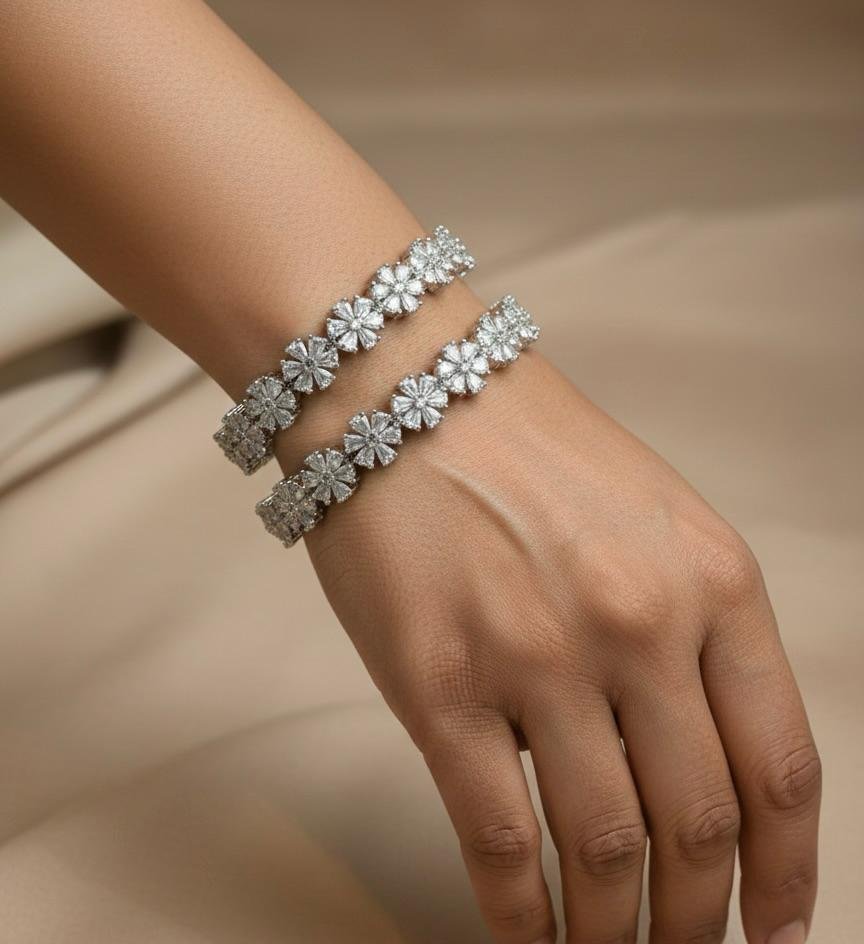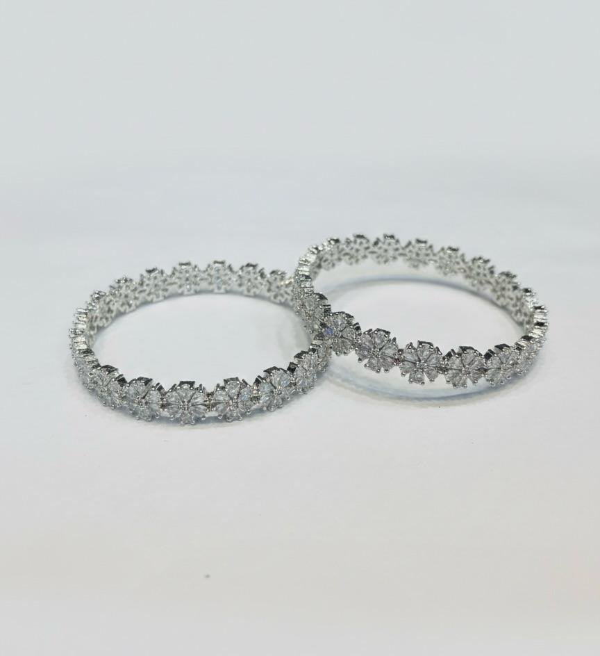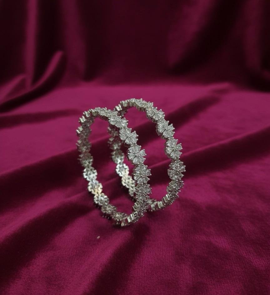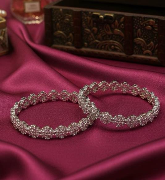 Affordable American Diamond silver plated bangles pair with bright sparkle. Perfect for daily & festive wear. Sizes 2.4–3.0. MRP ₹599.