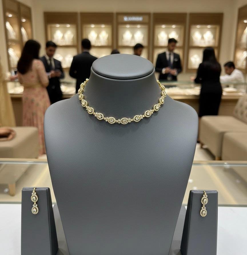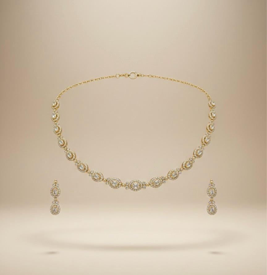 The Classic Glow American Diamond Necklace Set is designed for those who love understated elegance. Adorned with sparkling American diamond stones and finished with a rich antique gold polish, this jewellery set brings a traditional yet graceful look.