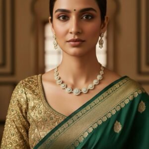 Add timeless elegance to your jewellery collection with the Emerald Glow American Diamond Necklace Set. Crafted with premium-quality American diamonds, this stunning set features an antique gold polish that enhances its vintage appeal. The graceful green stone combination adds a royal touch, making it ideal for weddings, festive occasions, and traditional celebrations.