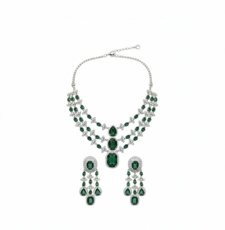 Stunning American diamond necklace set in a rich green colour combination with premium silver plating polish. Perfect for festive and special occasions.