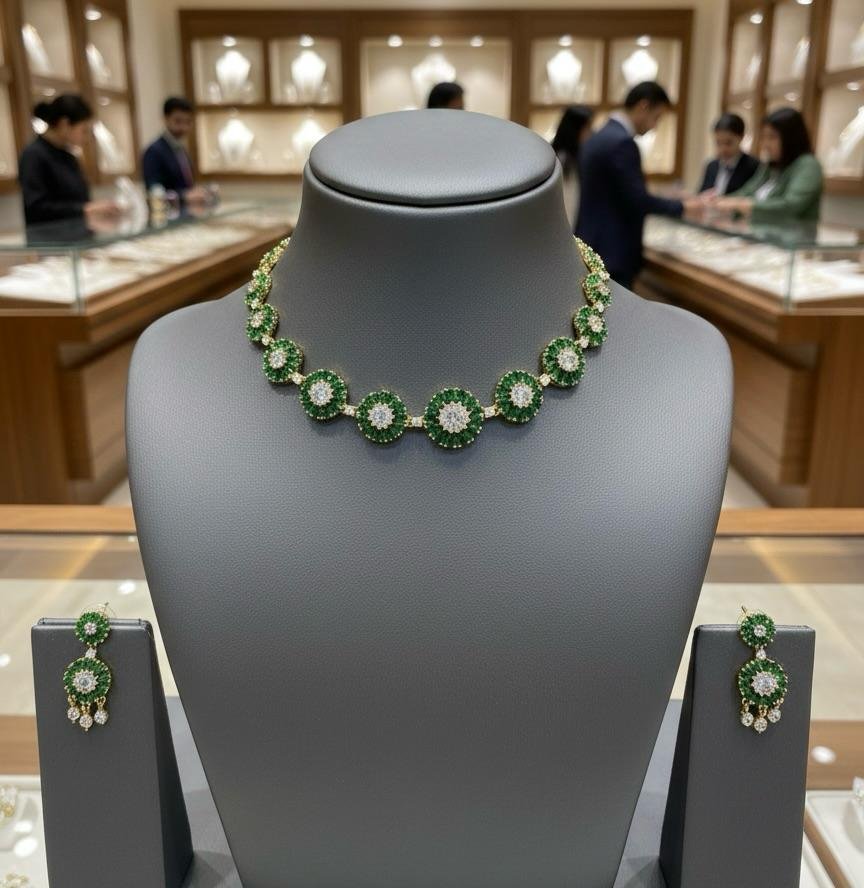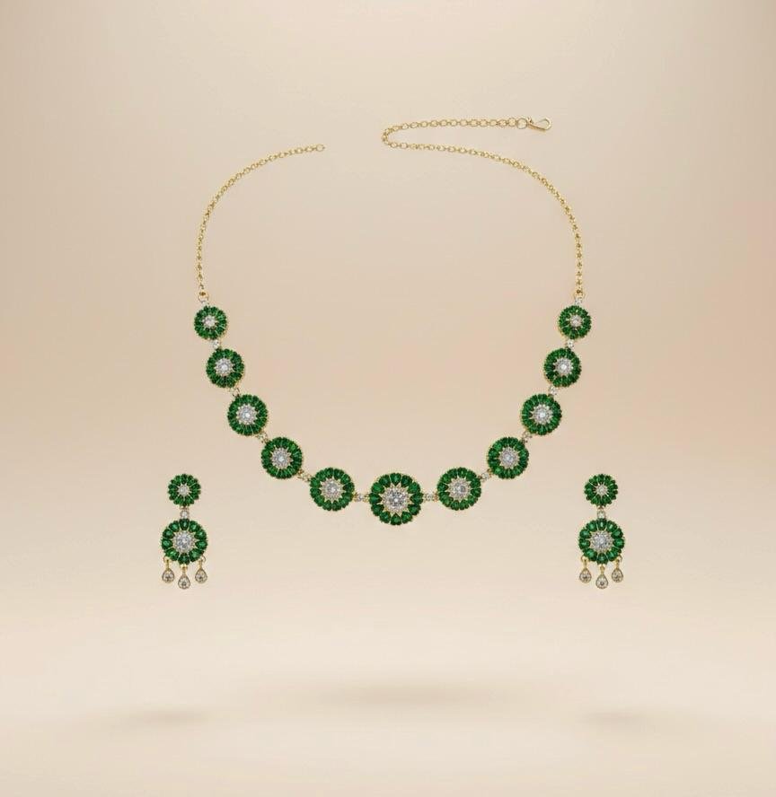 Be the first to review “Emerald Line Gold Polish American Diamond Necklace Set”