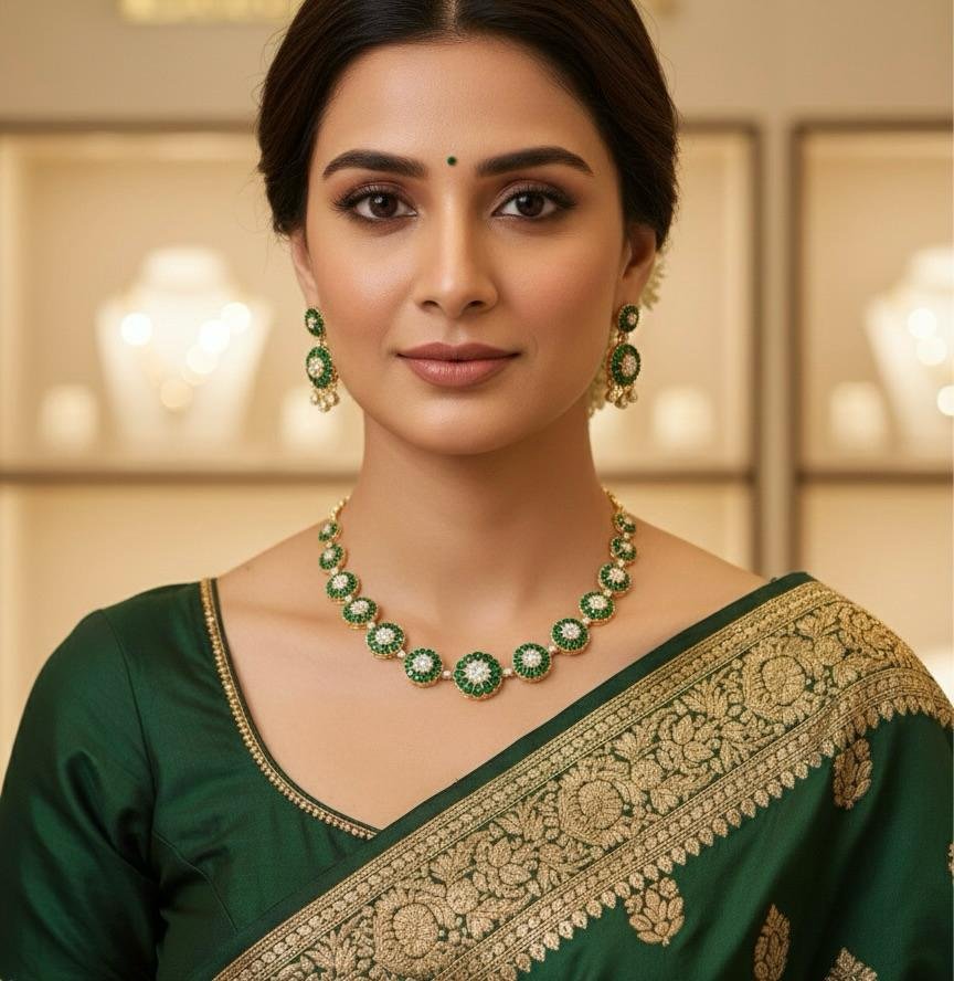 Add subtle elegance to your ethnic look with the Emerald Line Gold Polish American Diamond Necklace Set. Designed in a graceful single-line pattern, this jewellery set is adorned with sparkling American diamond stones and highlighted by a beautiful green colour combination. The gold polish adds a classic shine, making it ideal for both traditional and modern styling.