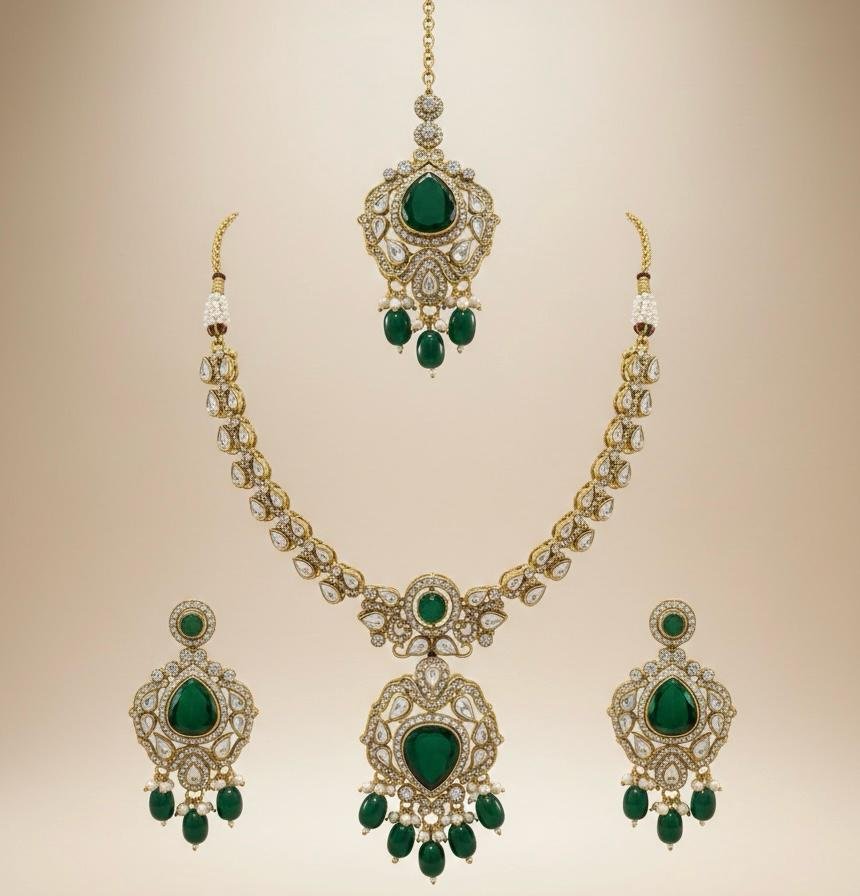 Exquisite reverse AD diamond necklace jewellery set with antique gold polish, detailed green pearl work, and matching tikka. Perfect for weddings and festive occasions.