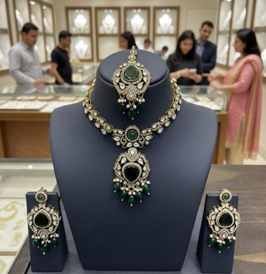Complete with a matching tikka, this necklace set is perfect for weddings, receptions, festive celebrations, and bridal functions. Designed to complement sarees, lehengas, and bridal wear, it offers a perfect blend of heritage craftsmanship and modern elegance. A truly eye-catching set for grand occasions and a premium gifting choice.
