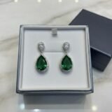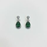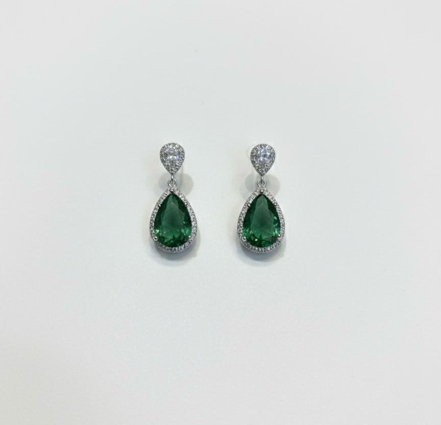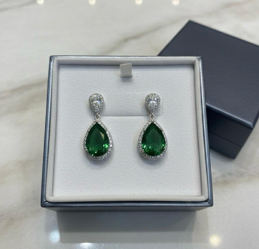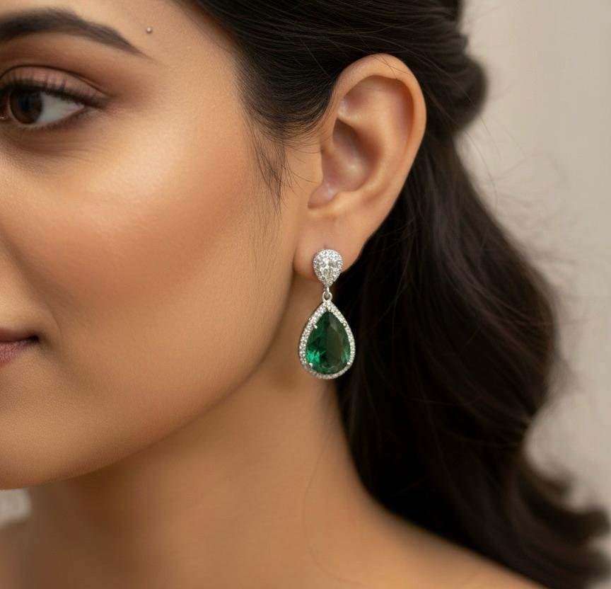 Elegant silver-plated American diamond earrings with stunning green stone work.