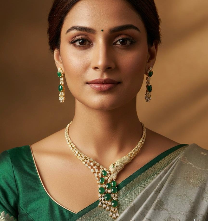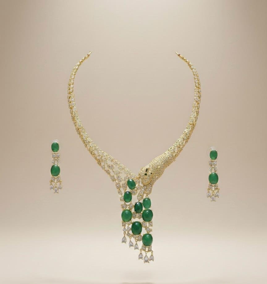 Premium tiger-style American diamond necklace jewellery set with rich gold plating polish and elegant green colour combination.
