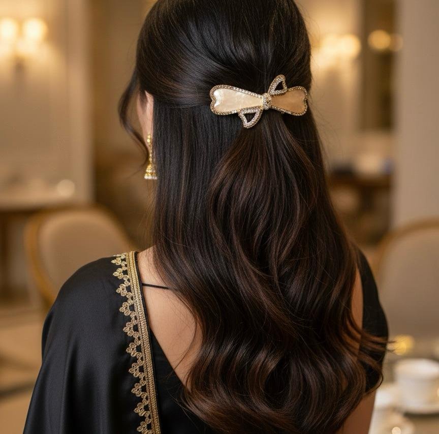 A classy hair accessory at a great value.Beautiful backclip hair accessory with golden stone and sheet work, finished with rich gold polish and secure double-lock style.