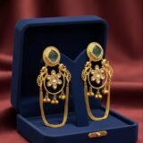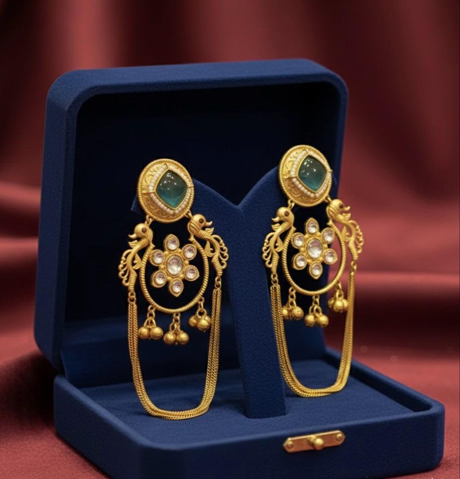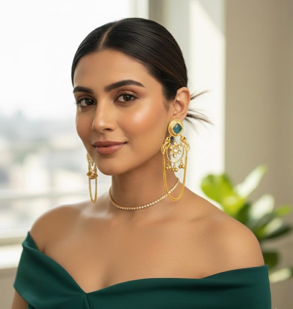 Add a touch of elegance and color to your outfit with these Kashmira earrings featuring beautiful green stone work. Designed with intricate detailing and a lightweight structure, these earrings are comfortable for all-day wear. Perfect for weddings, parties, festive occasions, or gifting, they bring sophistication and charm to any look.
