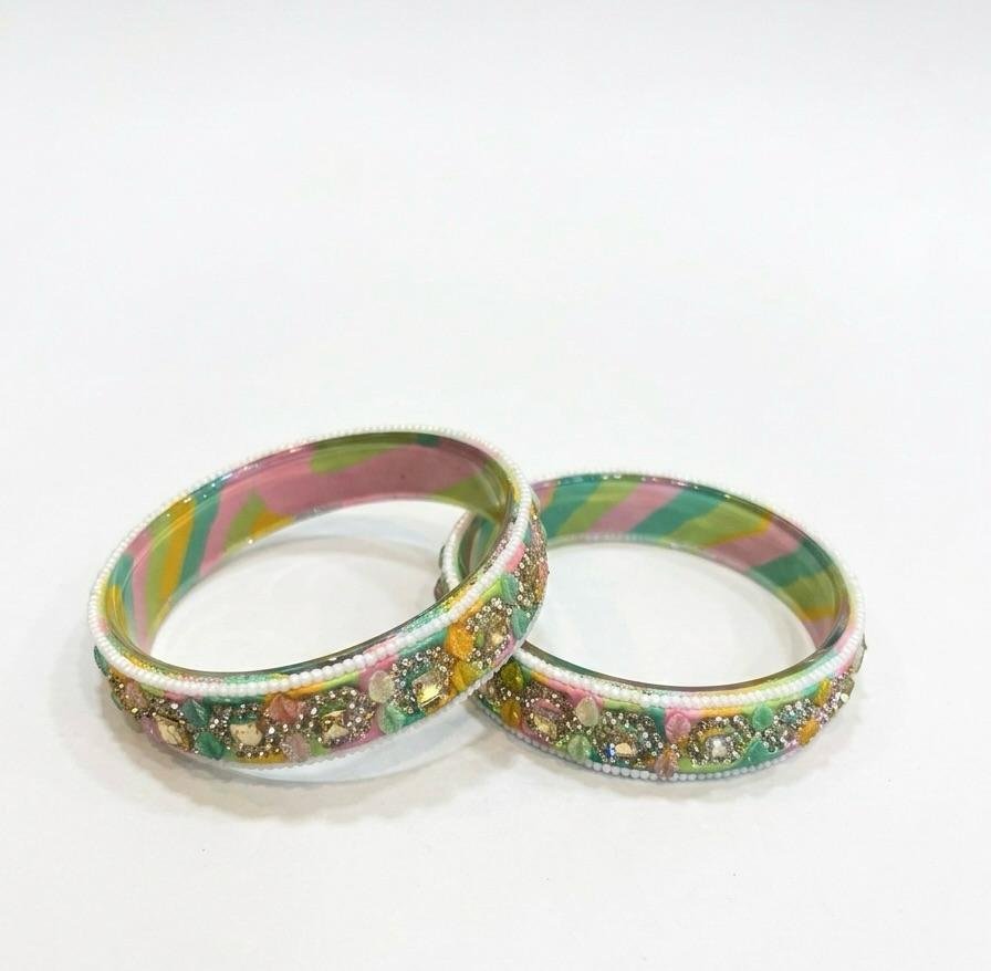 Beautiful light shade glass bangles with sparkling multi stone work, perfect for weddings, festivals, and ethnic outfits. Lightweight and stylish pair available in sizes 24, 26, 28.