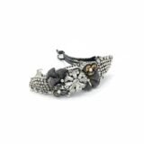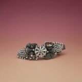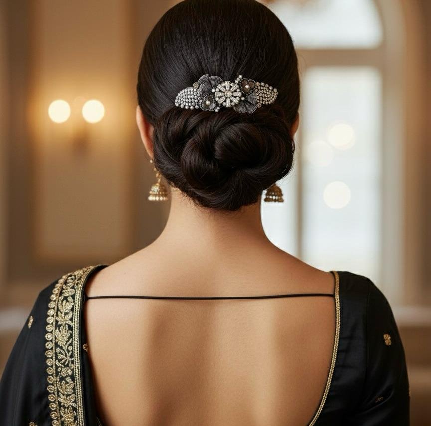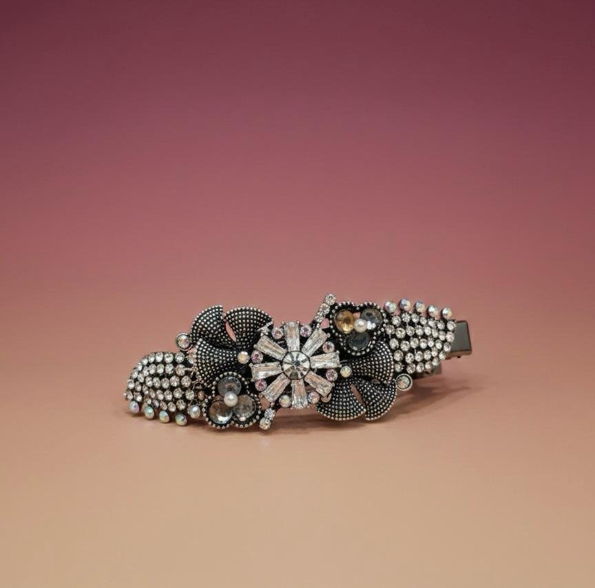 Stylish backclip hair accessory with silver and black stone work, finished in black metal polish and secure double-lock style.