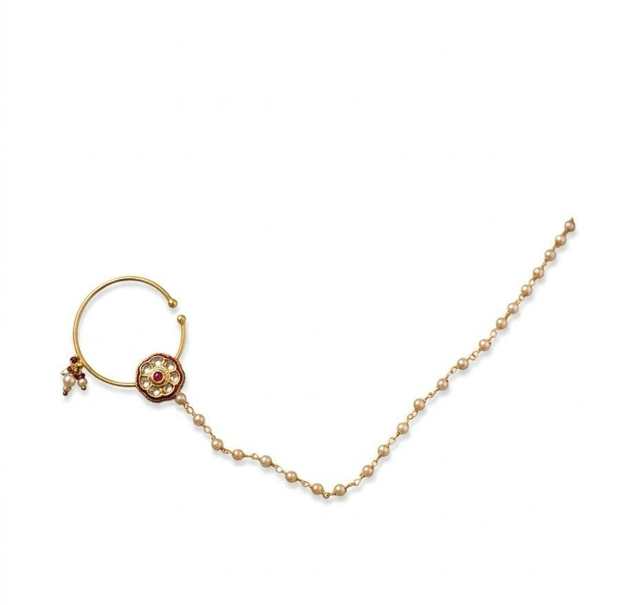 Elegant bridal nath with chain featuring Ad kundan work  detailing and gold polish finish. Perfect for wedding wear.