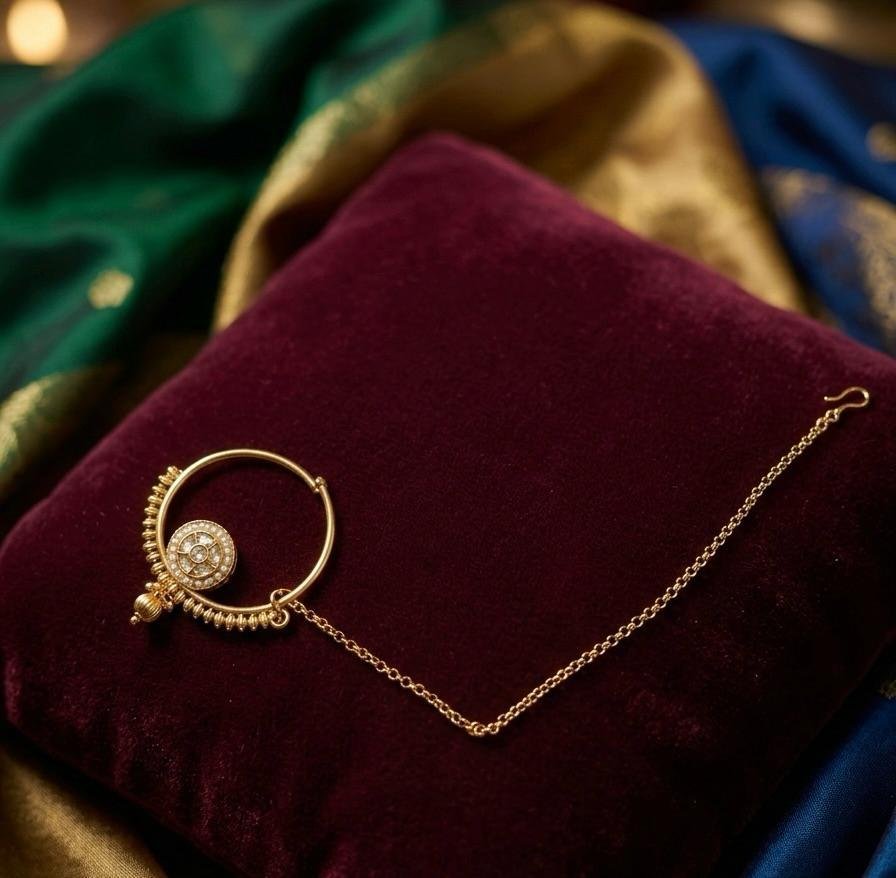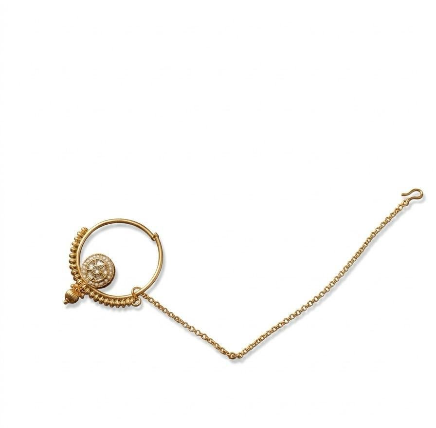Designed to add royal elegance and traditional charm, the delicate chain enhances its graceful bridal appeal. Perfect for weddings, receptions, and festive occasions, this nath is lightweight yet eye-catching — making it a must-have statement accessory for your special day.