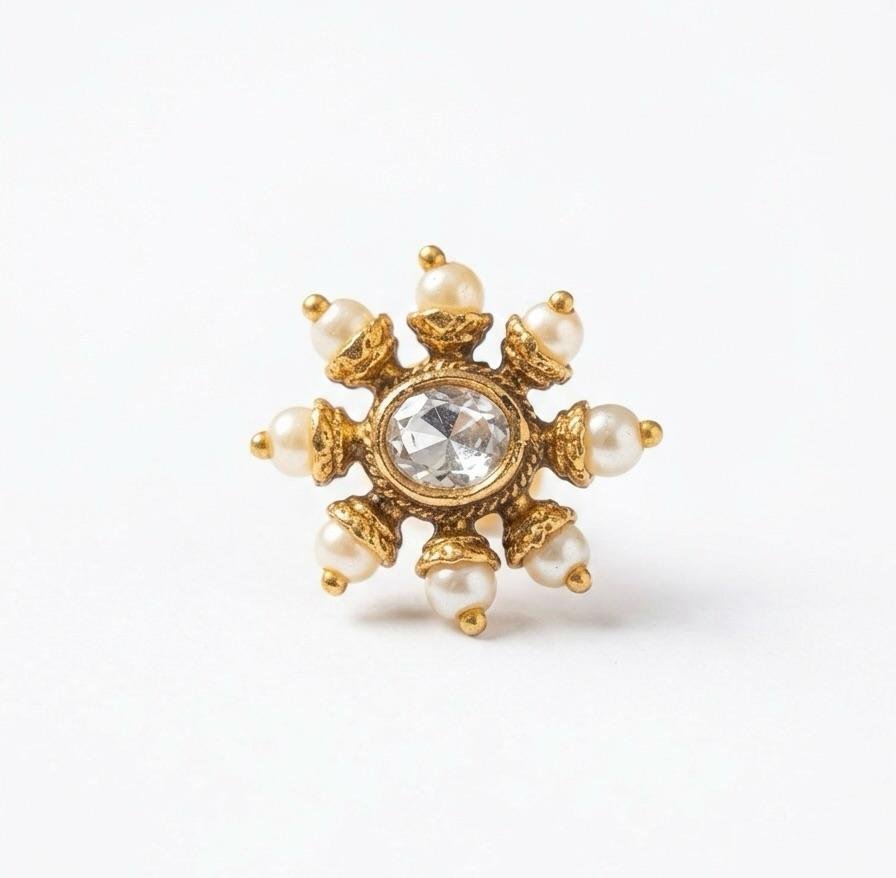 Elegant Kundan and pearl nose ring with rich gold polish finish. Lightweight, classy, and perfect for weddings & festive wear.
