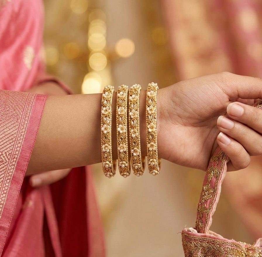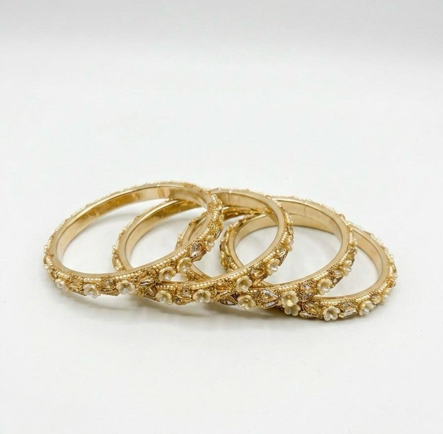 Elegant 4-piece brass bangle set with pearl & stone work in golden colour. Perfect for festive and traditional wear.