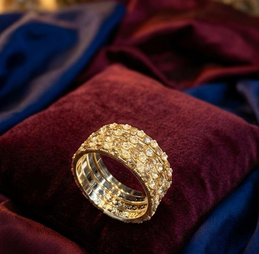 Enhance your ethnic look with this elegant 4-Piece Brass Metal Bangle Set featuring delicate pearl & stone work. Designed in a beautiful golden colour, these bangles add a graceful and timeless charm to your outfit.