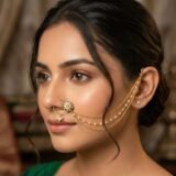 The delicate chain enhances its classic bridal appeal, making it perfect for weddings, receptions, and festive occasions. Lightweight yet eye-catching, it completes your ethnic ensemble effortlessly.