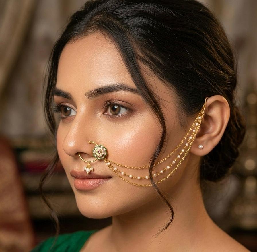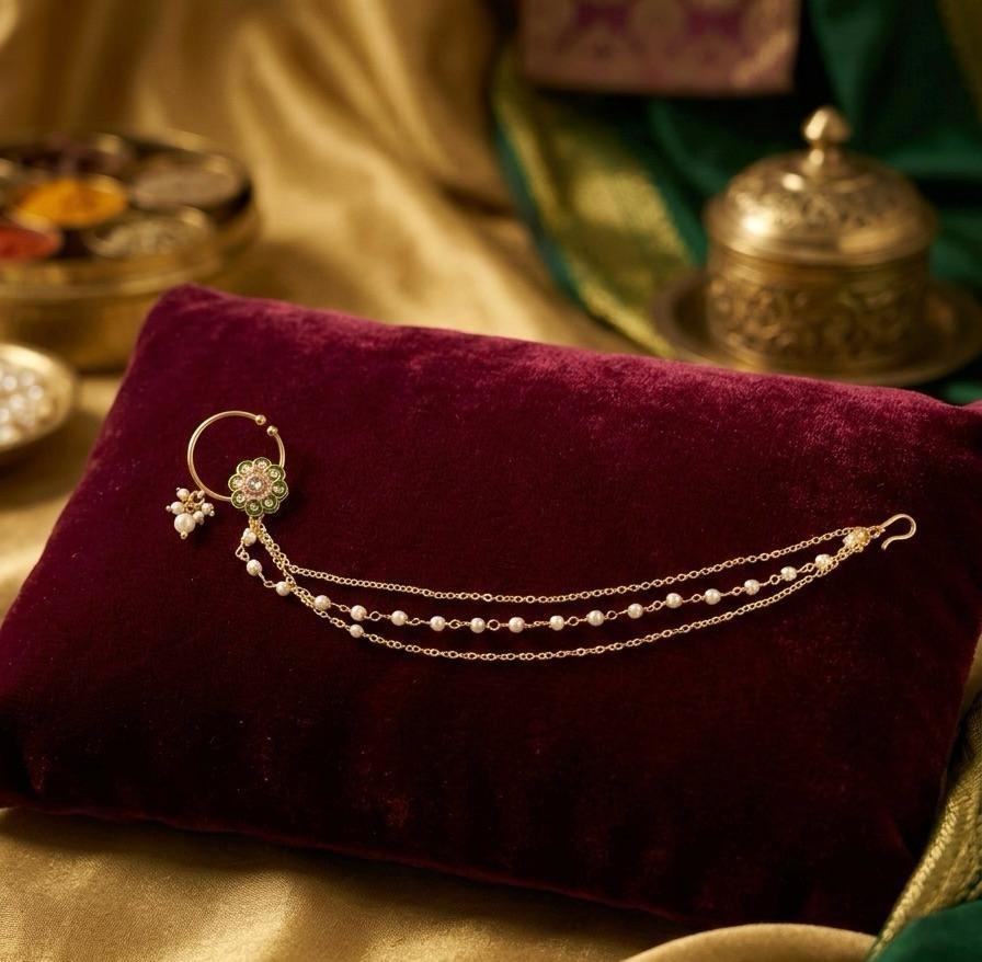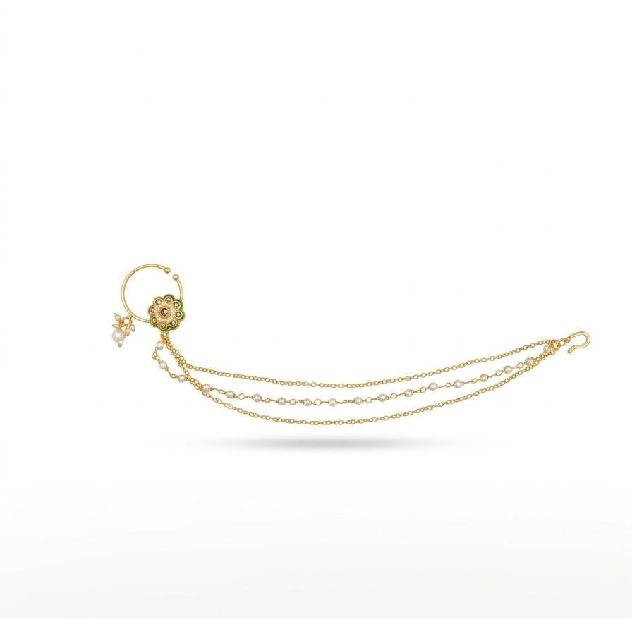 Add a touch of royal elegance to your bridal look with this stunning Bridal Nath with Chain. Adorned with sparkling Adi stones and finished in a rich gold polish ✨, this piece beautifully captures traditional charm.