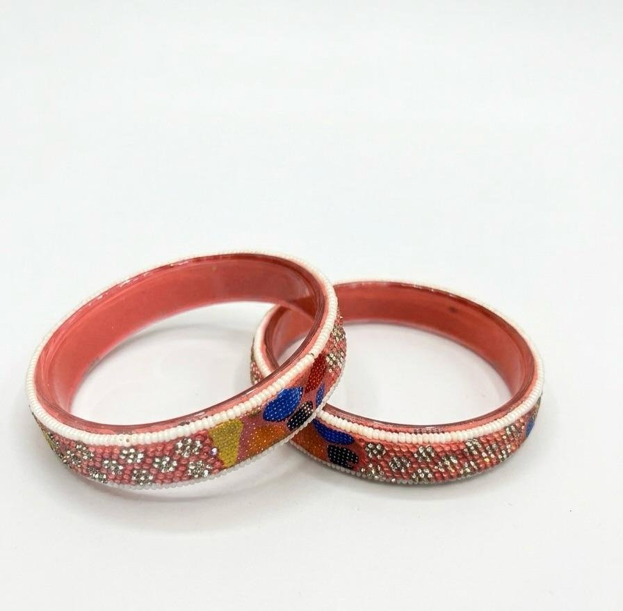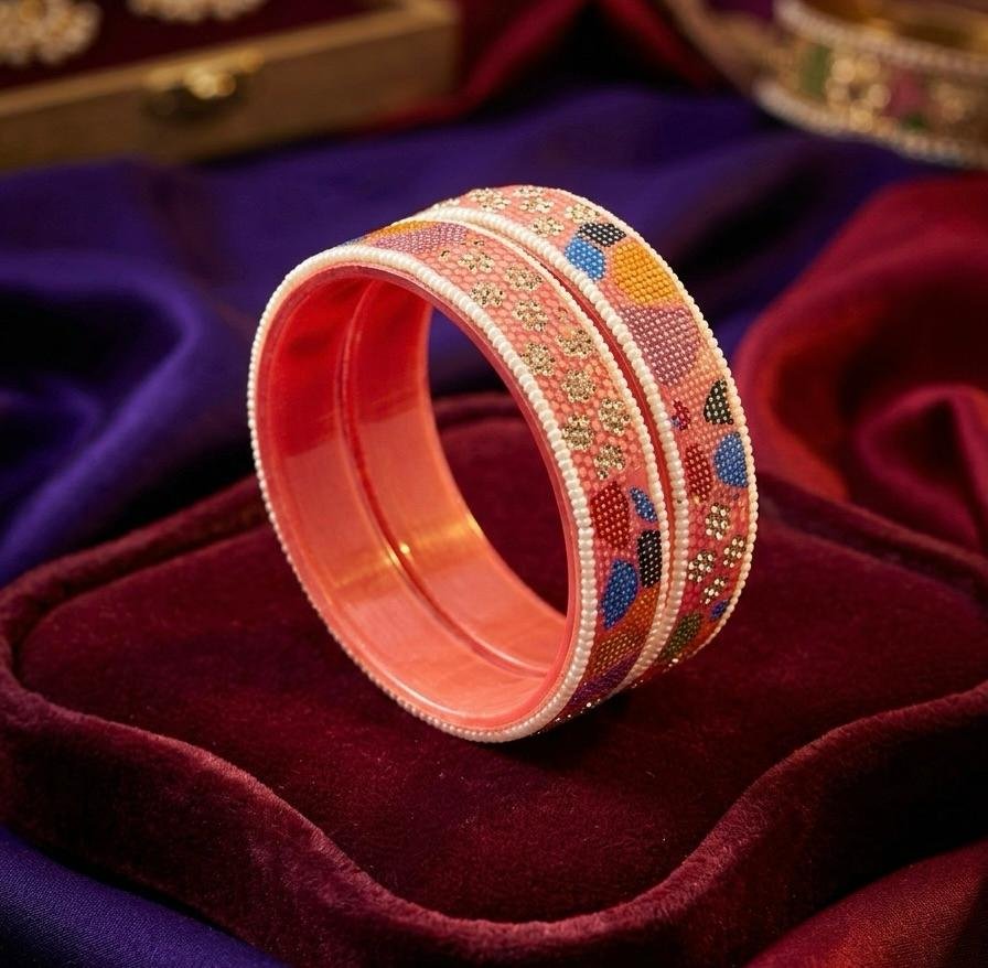 Beautiful peach color glass bangles with intricate multi work design, perfect for weddings, festivals, and ethnic wear. Lightweight and stylish pair available in sizes 24, 26, 28.