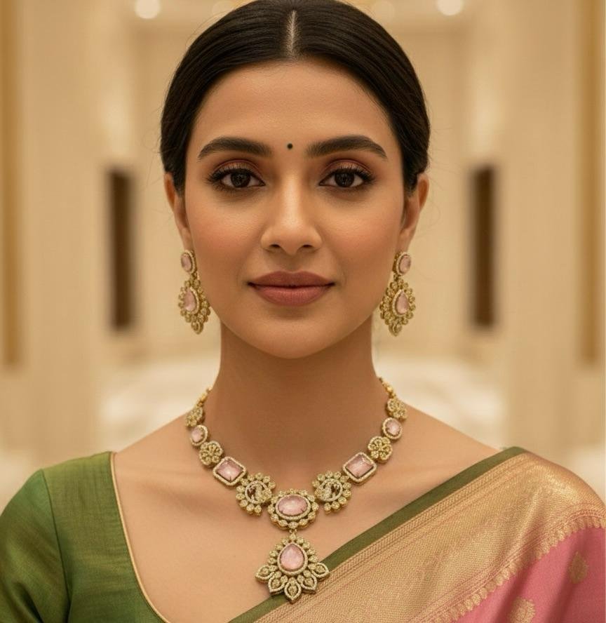 Elegant American diamond necklace jewellery set in a charming pink colour combination with antique gold polish. Ideal for festive wear, weddings, and special occasions.