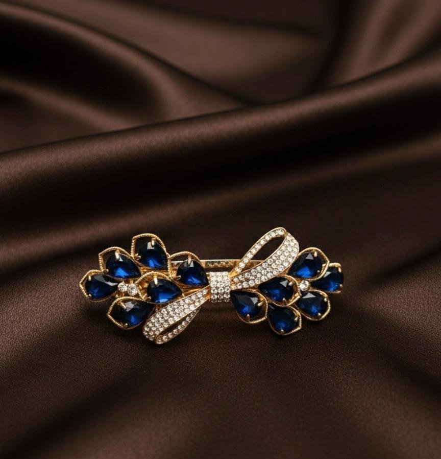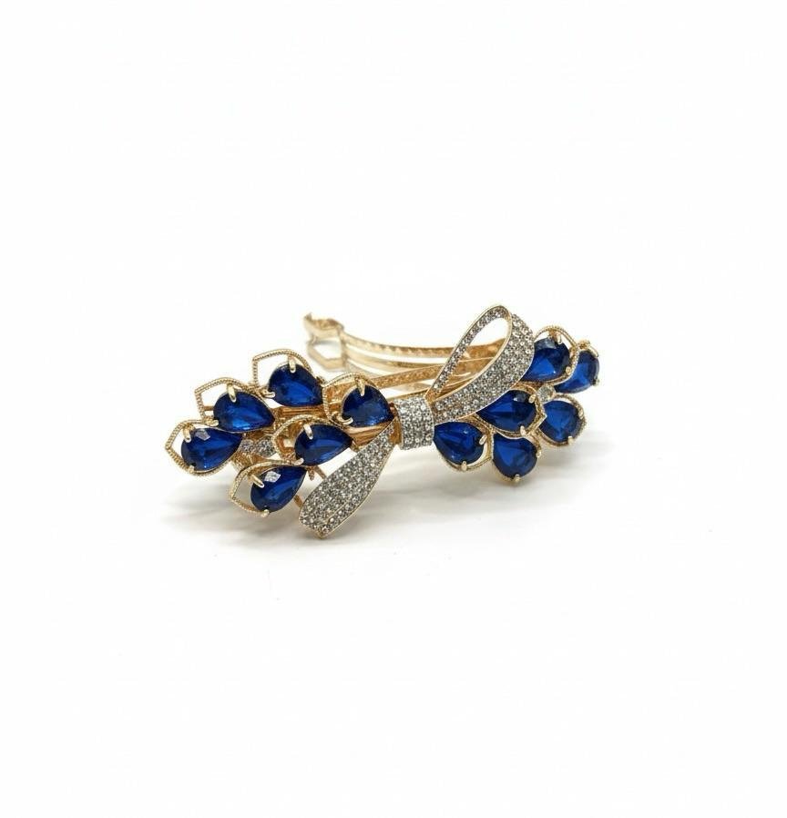 Enhance your hairstyle with the classy charm of the Royal Blue AD Gold Imported Backclip. Crafted with premium imported quality, this beautiful backclip is adorned with sparkling golden American diamond (AD) stones complemented by striking blue stone work. The smooth gold polish adds a luxurious finish, making it perfect for festive and party wear.