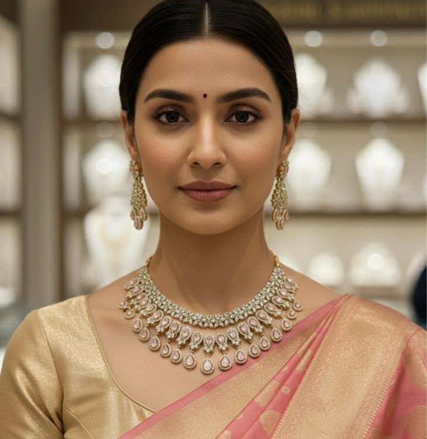 Make a timeless style statement with the Royal Blush Antique American Diamond Necklace Set. Crafted with high-quality American diamond stones, this elegant jewellery set features a soft baby pink colour combination that adds charm and sophistication. The antique gold polish enhances its rich traditional appeal, giving it a royal and luxurious finish.