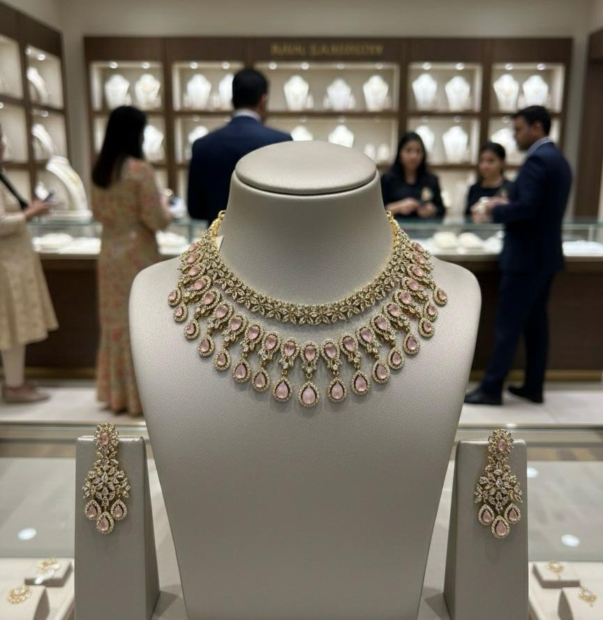 Perfect for weddings, receptions, festivals, and special celebrations, this necklace set beautifully complements sarees, lehengas, and designer ethnic outfits. Intricately designed and eye-catching, it is an excellent choice for bridesmaids and festive styling. This stunning set also makes a premium gifting option.