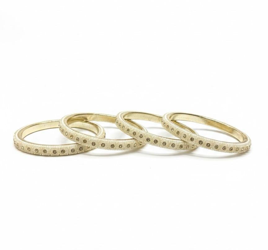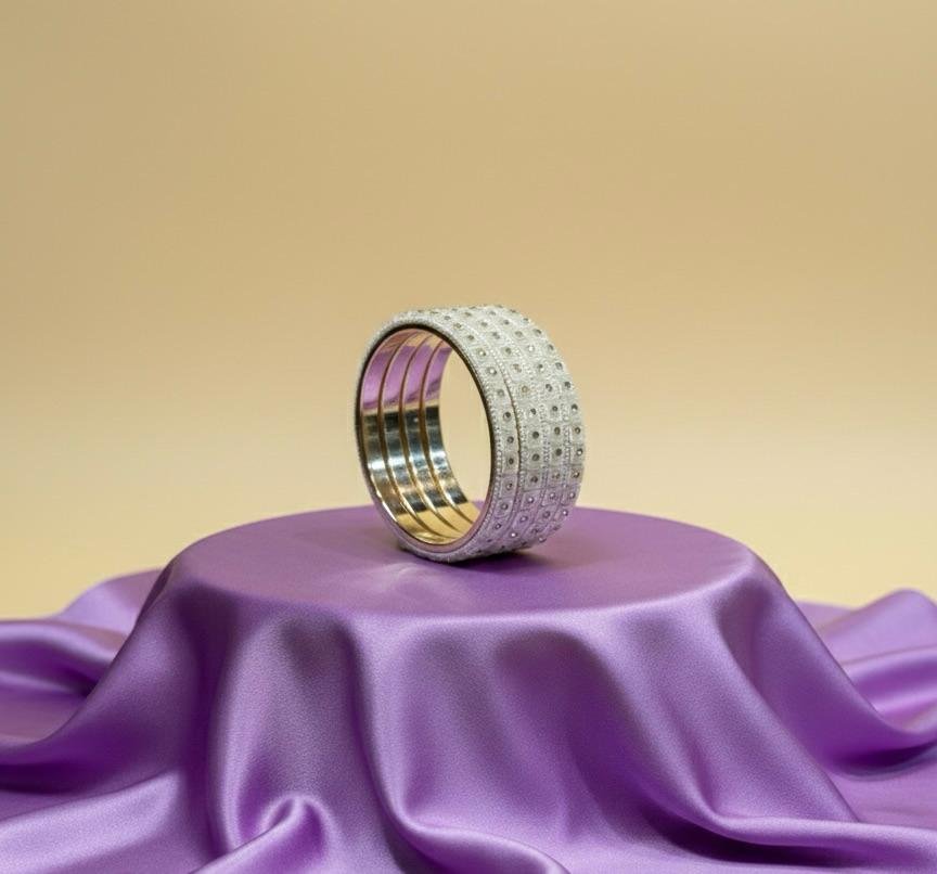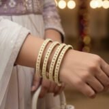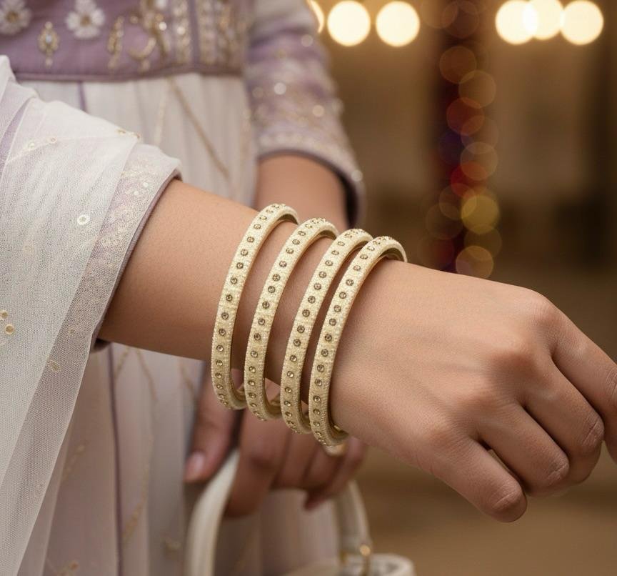 Elegant 4-piece brass bangle set with gold polish and cream finish. Lightweight, stylish, and perfect for festive & traditional wear.