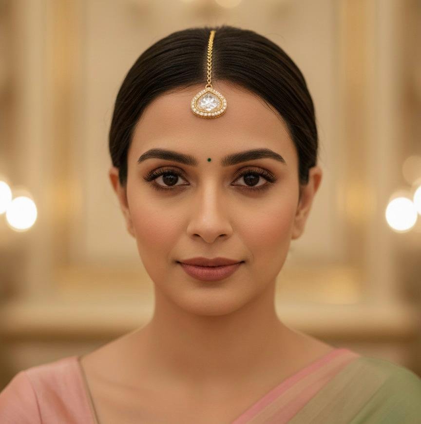 Add a royal touch to your ethnic look with this stunning maang tikka. Designed with traditional uncut kundan and shining American Diamond (AD) stones, this piece features a premium gold polish with a rich golden colour finish. Its elegant and traditional design makes it perfect for weddings, festive occasions, and bridal looks. Pair it with sarees, lehengas, or ethnic suits to enhance your overall style.
