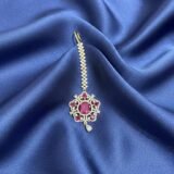 Enhance your traditional style with this stunning ruby color AD stone maang tikka crafted with sparkling American diamond stones and finished with a rich golden polish. The beautiful ruby stone design combined with the elegant golden finish creates a perfect bridal maang tikka look. This stylish traditional tikka for women pairs beautifully with saree, lehenga, and ethnic suits, making it ideal for weddings, parties, and festive occasions. Lightweight and comfortable to wear, this AD stone golden tikka adds a royal touch to your jewellery collection.