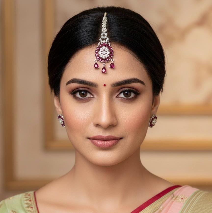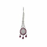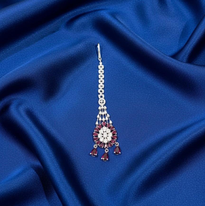 Add a touch of elegance to your traditional look with this stunning maang tikka. Designed with premium American Diamond (AD) stone work and highlighted with attractive ruby colour detailing, this piece features a classy silver polish that gives it a bright and graceful finish. Perfect for weddings, festive occasions, and party wear, it pairs beautifully with sarees, lehengas, and ethnic suits.