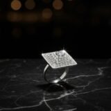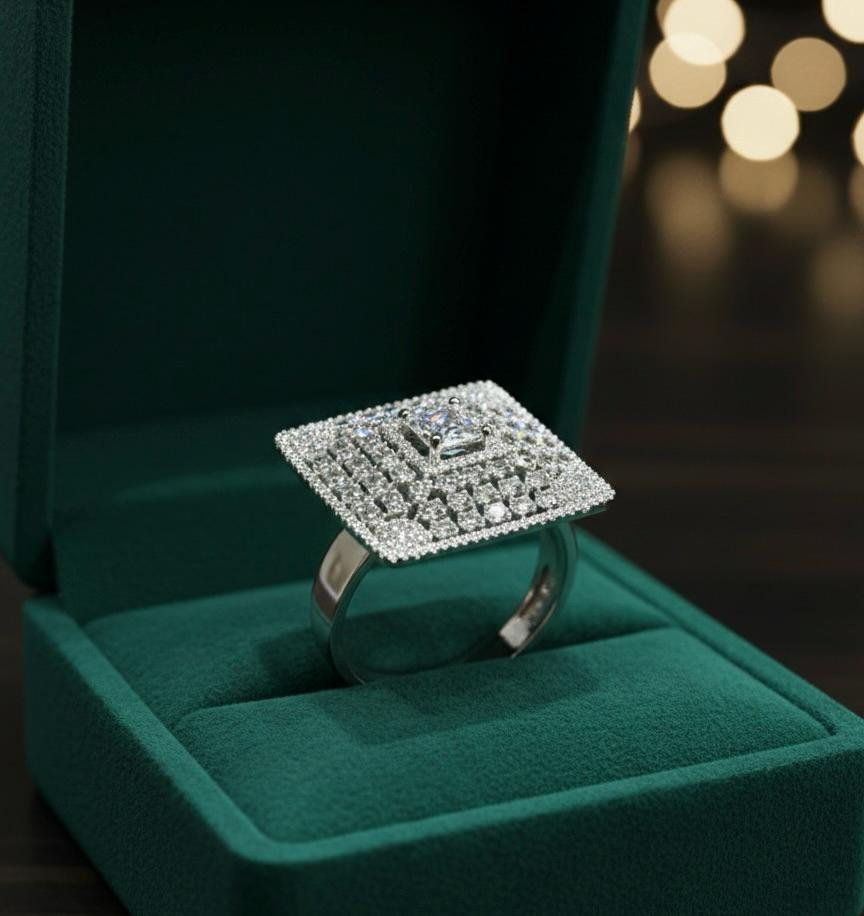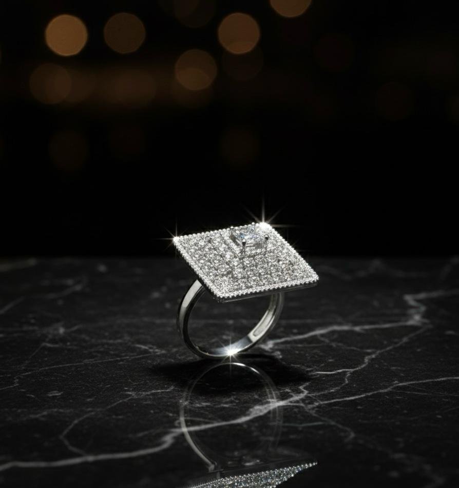 Elegant American diamond finger ring with premium silver plating polish, shimmering silver stone work, and adjustable size for a perfect fit.